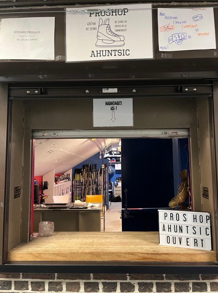 Le Proshop est une coopérative jeunesse de services située dans l’aréna Ahuntsic. Un groupe de cinq jeunes a été recruté dès la fin de l’été pour faire partie de la cohorte 2023-2024. Leur offre de service est l’aiguisage de patin et le prêt de matériel pour patiner et/ou jouer au hockey. Les jeunes ont été formés sur les bases d’une coopérative, sur le service à la clientèle et l’aiguisage de patin bien sûr. Le ProShop ouvre ses portes aux alentours du mois d’octobre et offre environ 150 jours d’ouverture à la clientèle de l’aréna en semaine et fin de semaine. Pendant la saison, les jeunes tiennent une assemblée générale par semaine, pour prendre des décisions concernant leur horaire de travail et le fonctionnement du ProShop.