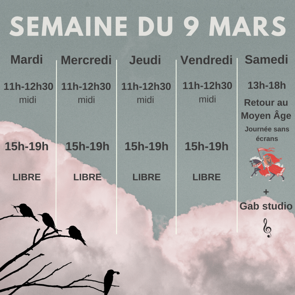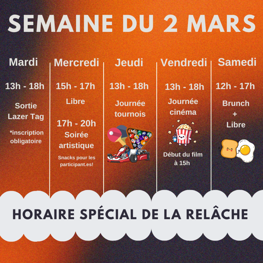 Notre horaire peut changer, consultez nos réseaux sociaux pour plus d’informations.